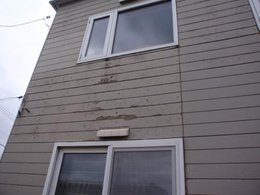 右上の写真は築25年のサイディングが張ってある建物外壁です。 表面の傷みがかなり進行しています。 表面の傷みだからと表面のサイディングを張り替えてもダメです。問題はその中にあるからです。 まして、この上にサイディングを張るなどというリフォームはやらない方が良いでしょう。