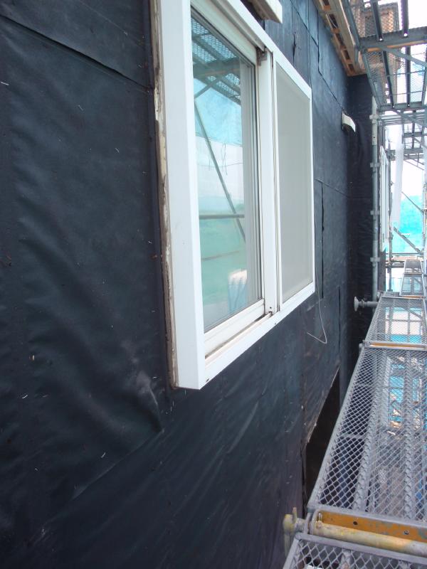 上の写真は外装材を剥がした状態です。 黒いシートは防水紙(アスファルトルーフィング)で 一見、問題無いように見えます。 しかし、私の改修のご提案はこの黒い防水紙も剥すというものです。