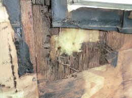 結果は下の写真のように窓下の木材に腐れの状態がありました。 全体を調査した結果、この現象は他に 3ヵ所ありました。 これは当然、何らかの補修が必要ですので 施工会社の方に改修内容を指示しました。