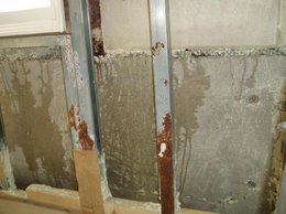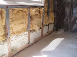 上の写真はその1階の外壁面の内部壁を 剥がした状態です。 何度か、いろんな改修工事をしているようで それでも直らないという経緯があります。 内部の石膏ボードを剥がすと 上部に黄色いグラスウール(断熱材)があり その下の部分に発泡ウレタン(白色)があり これが、その改修工事の1つのようです。