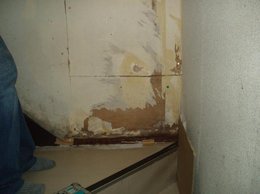 上の写真は何度も雨もりが続いている箇所の 一部ですが、内部壁を剥がして 外部から散水試験をした結果が 下の写真です。 これで原因と浸入口が確定できました。