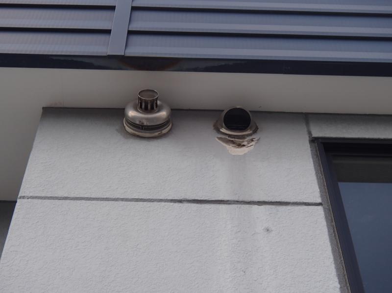 最近の住宅では、あまり見かけませんが? 10年以上前の住宅では このように換気フードの周りの外装材が 破損している現象がよく見かけます。
