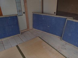 床下点検口がない場合、 下の写真のように和室の畳をはぐります。 板が小さく切ってあり、簡単に外せることがあります。 その開口から身体が入るようであれば、 床下に侵入して調査をします。 それがない場合は 板のすき間から、覗いたりもします。