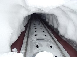 上の写真は点検の為、屋根に上がり撮影しました。 無落雪屋根(スノーダクト、M型屋根とも) いろんな呼び方がありますが、 三角屋根と違い、雪を屋根にのせておき、 自然に雪が融けるのを待ちます。 そこには、融けた水を流す「横樋と縦樋」が ありますが、この写真はその横樋にカバーを かけてあるもので、 カバーの上の雪がかなり融けています。 これは排水の温度が高いので、大きく融けて まるでドームのようになっています。