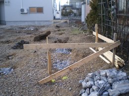 上の写真は「やり方」という基礎工事を 始める前に建物位置を決めるもので この写真では次の工程である 杭工事が完了した後の状態です。