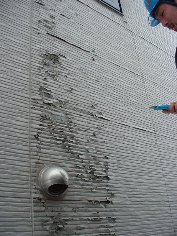 上の写真は外壁がかなり、傷んでいます。 この上にどんなに良い塗装をしても 直りません。 また、この上にどんなに丈夫な外装材を張っても、直りません。 それは原因を直していないからです。