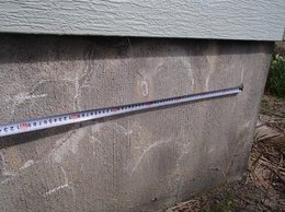 上の写真はその鉄筋測定をしていると 「白いシミ」がどうも気になりました。 基礎はコンクリートの上にモルタルで仕上て いる場合が多く、そのモルタルの劣化かなと 思いました。