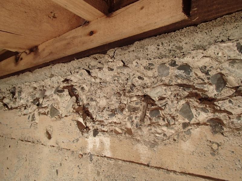 床下に入るとその裏面、コンクリートを 直接、診ることができます。 下の写真は上の写真のちょうど、真裏です。 その部分だけ、コンクリートがかなり劣化して、崩れてきていました。 あのシミは地盤面から出てきた湿気によるものと思われます。 この部分はおそらく、施工当時のコンクリートの品質が原因と思われます。