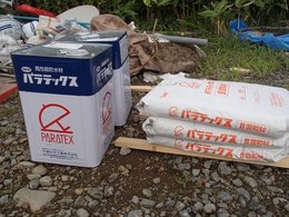 上の写真は今回、採用した防水材です。 この下地と状態には、これが最適という判断です。
