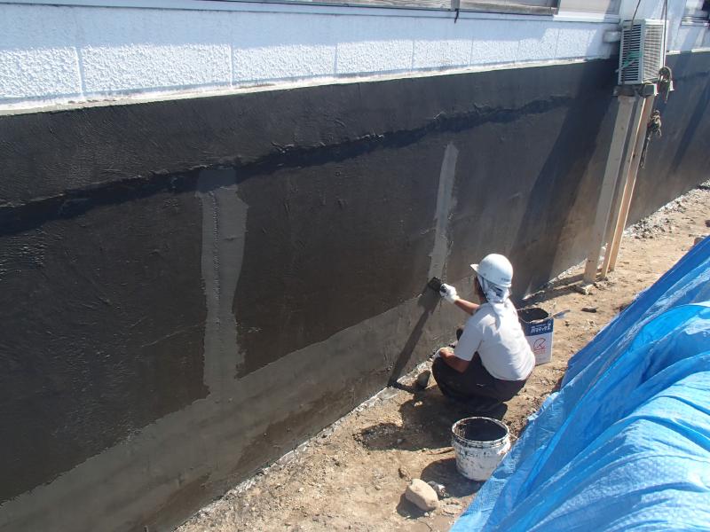 下の写真は実際の施工状況です。 2回ぬりの施工です。 この防水材は乾燥すると黒くなります。 その上に2回目の施工をしている状況です。