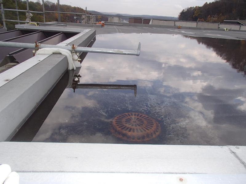 上の写真は現在、改修工事を実施している 屋上のある日の状況です。 板金の屋根とは違い、防水シートで施工されているので、すぐに雨もりは起きませんが? これ以上、溜まると屋上から、水が溢れ出します?