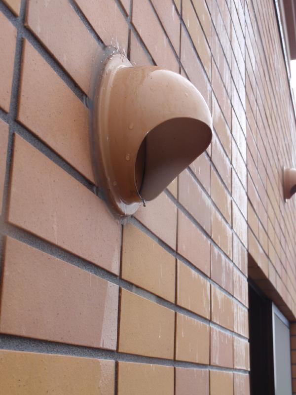 原因は外部側のタイルとこのパイプの部分にあります。 外部から、フードを外して、この部分に シールすることで直りました。