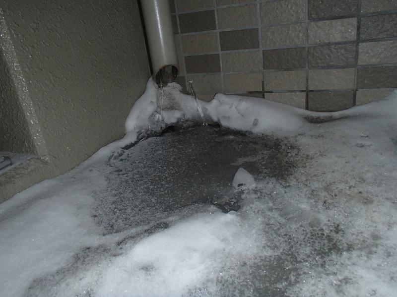 この時期は一戸建ての住宅では「すがもり」が起きやすい気候が続きます。マンションでも北側バルコニーではこんな状態が続いています。暖気になり・・・・氷が融ける・・・・・排水パイプの氷が融けてからバルコニーの氷が融けてくれると良いのですが・・・・バルコニーの氷が先に融けると排水ができないためその水が部屋の中に浸入することがあります。バルコニーに氷が出来ていたら要注意ですよ。