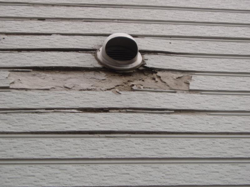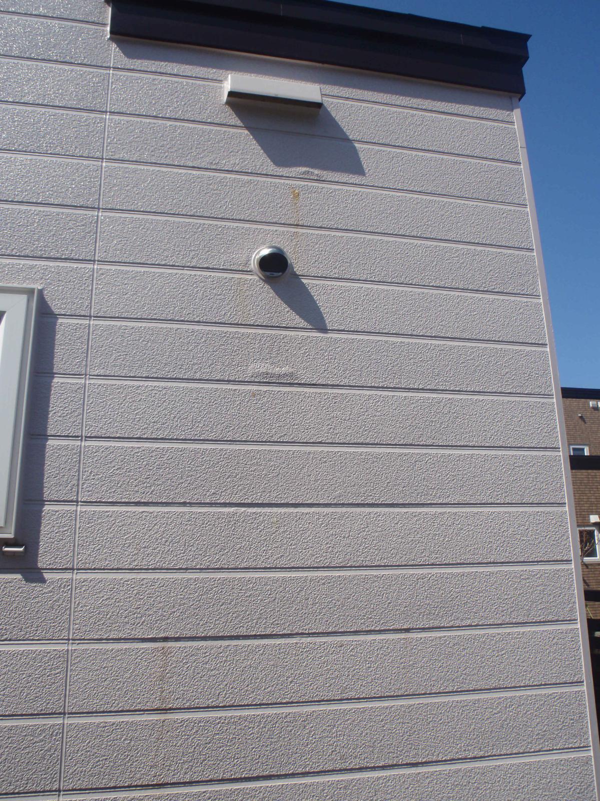 外壁のフードの周りの 外装材が破壊されています。