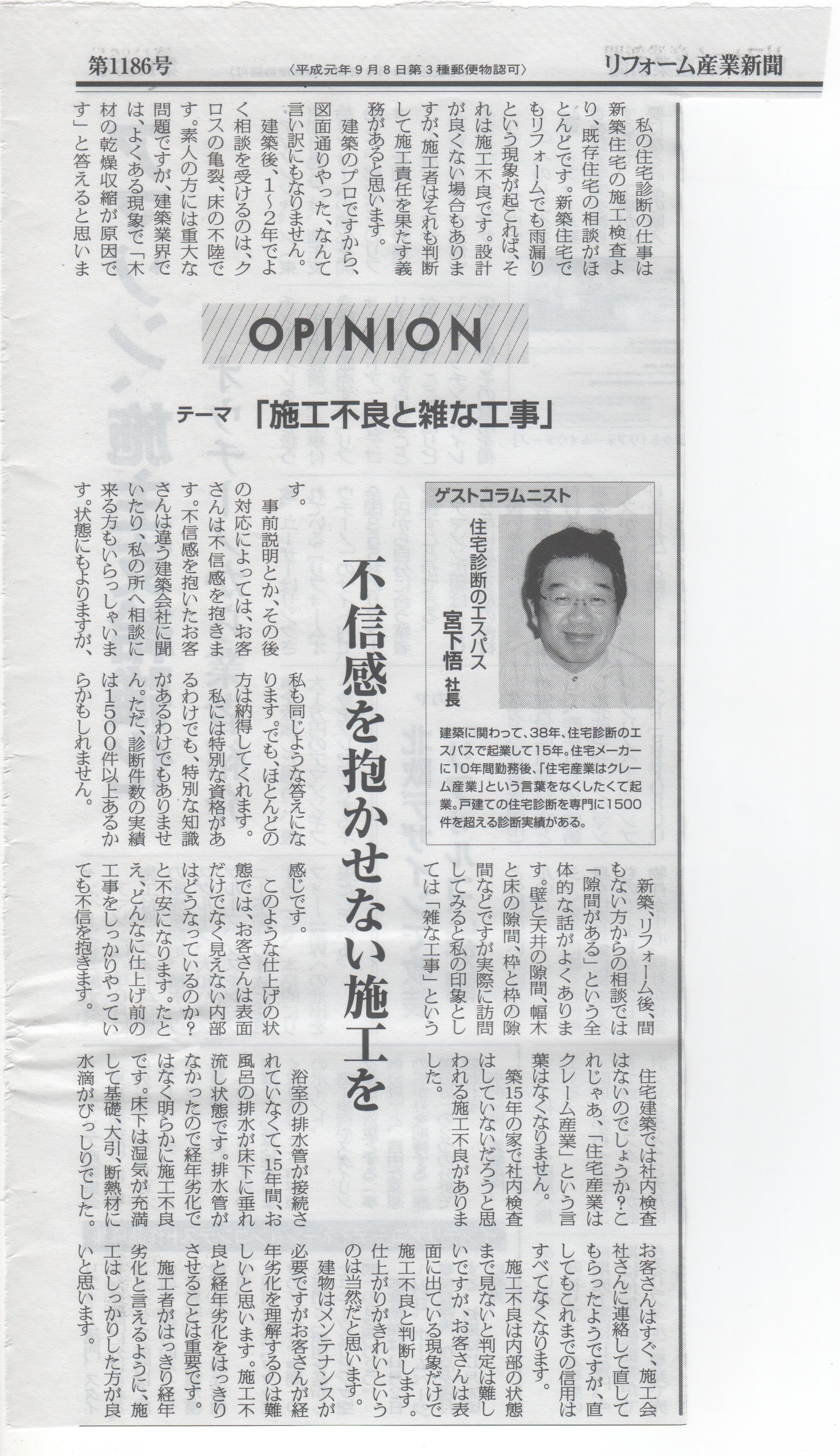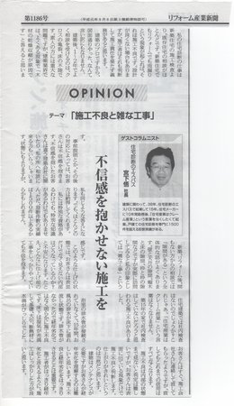 一般の方がほとんど、読む機会がないと思いますが9月29日付けでリフォーム産業新聞に私のコラムが掲載されました。業界向けとしてはかなり辛口かもしれません。