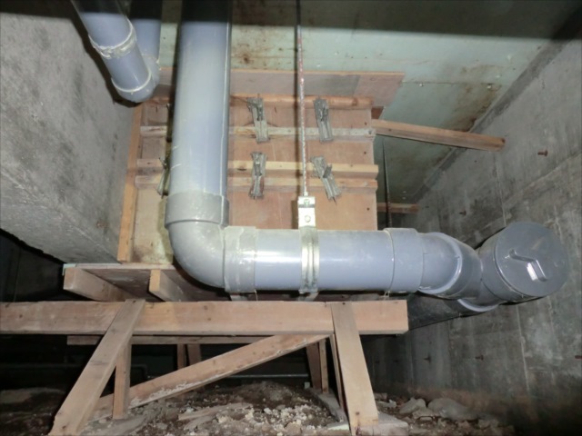 地面の下がりで 排水管が露出しています。