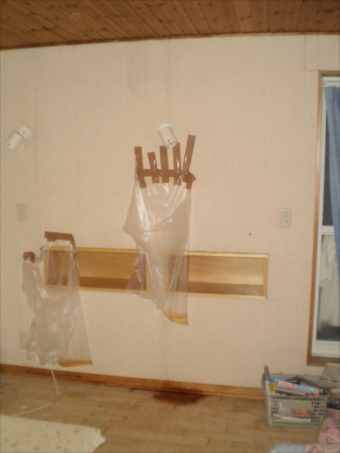 ところが家の数か所に 天井から、流れ出す、水の対策で 壁に袋が設置されていました。