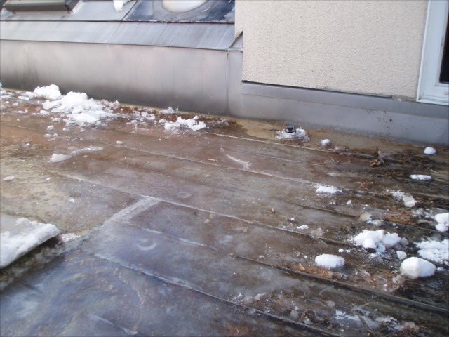 この水は屋根の上の雪が融けたものなので まずは雪をよけて、少しでも 漏水を減らすことでした。