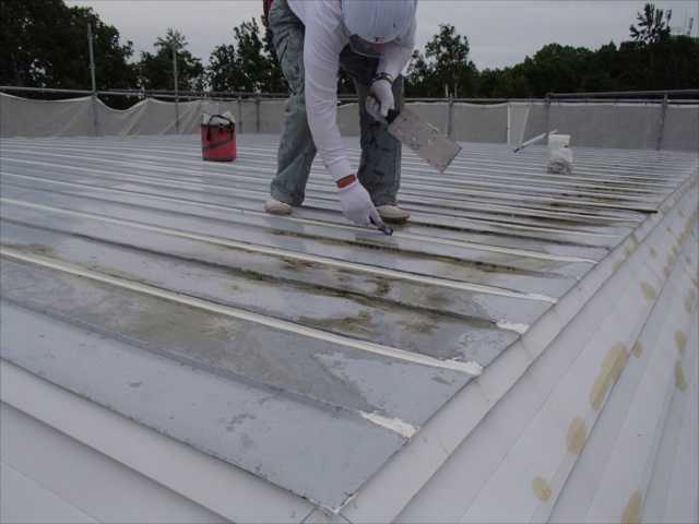 次に板金のハゼ締めを行い、コーキング施工