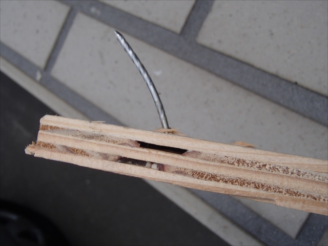 写真のように合板の場合は 中の材が抜けて空洞になるという 現象が起きており 合板の強度が極端に減少します。