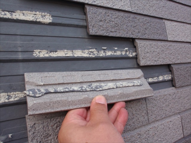 ベースボードサイディングの突部分に 接着剤を付けて、タイルを引っ掛けます。
