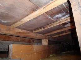 天井裏の状態は「雨もれ、すがもれ、結露によるカビ、腐れ、破壊」が発生しています。 この状態でも、天井にシミがなければ、たとえ住んでいても分からないかもしれません。 でも、この状態はかなり重症です。