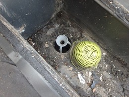 次の写真は 縦樋パイプを塞ぐような ゴミがあります。 どこからか飛んできたゴミは 防ぎようがありません。
