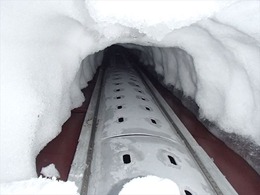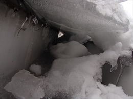 この空洞の上には雪が覆いかぶさっています。 日中の暖気が強いと雪が融け この空洞を潰し、横樋の排水を妨げます。
