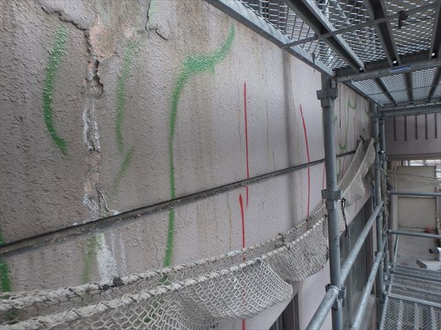 改修工事前に足場を掛けて 全面をチェックして適切な処理を 行なっていきます。