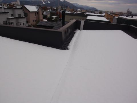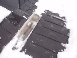 雨が降った訳でもなく、兎に角、屋根に上がって見ると写真のように雪が積もっていました。よく見かける風景ではありますが、 横樋部分の雪を取って見ると横樋にはシャーベット状態の雪がびっしり詰まっていました。 どうやら、このシャーベット状の雪が雪融けの水の排水を妨げていたようです。 水の凍結で排水を妨げ、屋根板金の隙間から水が逆流する現象がすがもれですが、 今回は氷ではなく、シャーベット状の雪が原因でした。 木造住宅で一般に使用されている、板金屋根は完全防水ではなく、屋根に水が溜まってしまうとその接合部分から、水は浸入してきます。 これは施工不良という事ではなく、天候によるもので、起こる場合と起こらない場合があります。 事前の対策としては、横樋にスノコを設置する、ヒーターの設置などがありますが、折角ヒーターが設置されていても、スイッチを切っていては意味がありません。