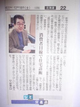 先週の18日ですが、毎日新聞の北海道版の「ひと交差点」で紹介して頂きました。この住宅診断事業も10年が過ぎましたが、今だに「そんな仕事あるんだ〜」とか「もうチョット前に知っていたら」と残念がる、お客様もいらっしゃいます。これで少しでも、知って頂けると嬉しいです。