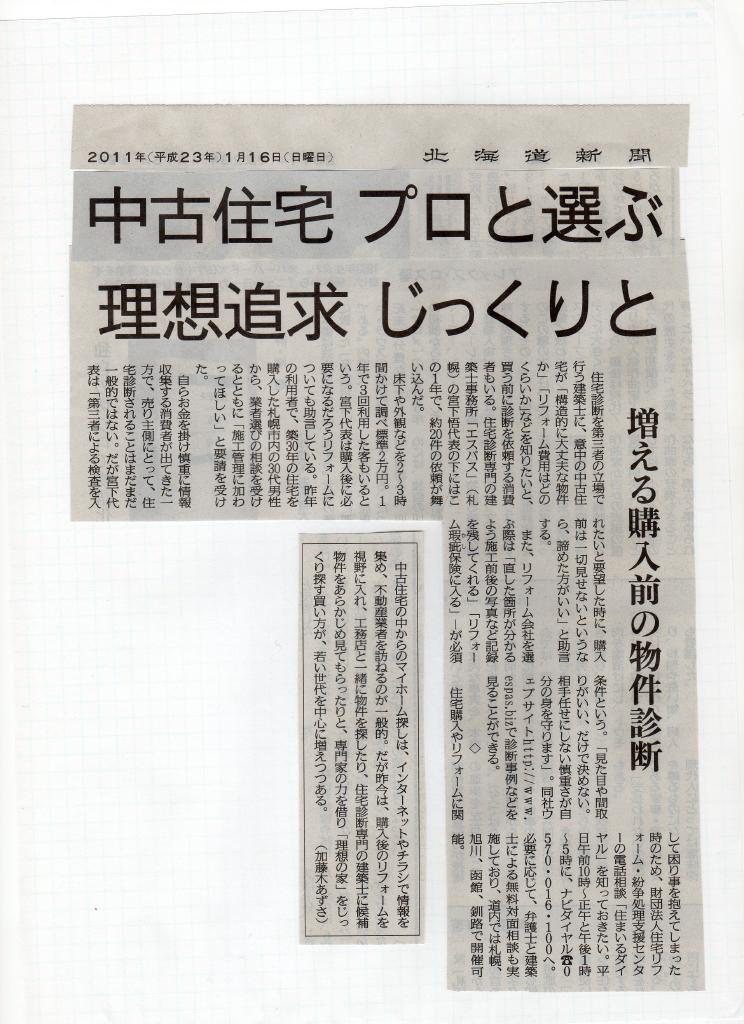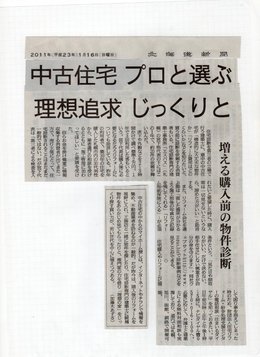 「中古住宅プロと選ぶ、理想追求じっくりと」記事全体はかなり大きいので私の関連のみ、アップしました。記事全体としても、とても素晴らしい内容になっていますので、全体を見たい方は北海道新聞(1月16日付)をご覧ください。