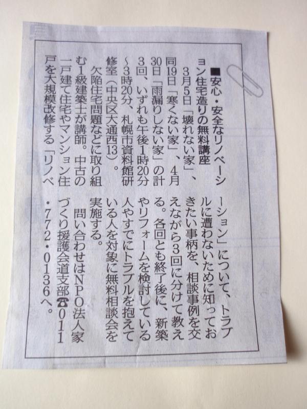 私が参加している「NPO法人 家づくり援護会」の北海道支部が主催する無料講座のご案内です。先日、北海道新聞にも掲載されました。第一回は「壊れない家」をテーマに3月5日(土)13:20〜15:20場所は札幌資料館研修室(2階):札幌市中央区大通り13丁目です。今回は私が2部を担当し、1時間程、事例写真を使ったお話させて頂きます。お申込は北海道支部:011−772−0136または私まで直接、メール、FAX、電話でお申込ください。