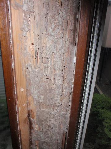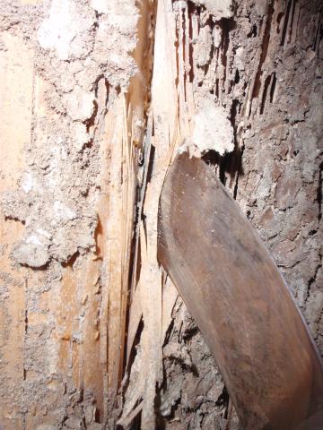 この後、大至急、駆除業者を呼んで薬剤散布で処理をしました。 まずは白蟻の巣に散布 そして、ほとんど原形が無くなった「柱」の 補強です。柱が無くなったら、家は倒れます。