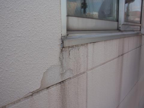 この剥がれの大きな問題点は窓サッシの下についている、皿板という水切りが原因です。 更に目地部分の下地処理が不適切だったことも原因の一つです。