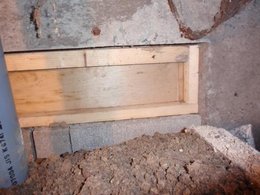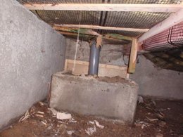 右の写真は中古住宅購入後の検査依頼があり、 床下に入った時に撮影したものです。 トイレの下で便層が残っています。 水洗化に伴い便層が不要になったのですが、便層は解体しないで、中には土が入っていました。 便層の内部もきれいな状態だったので、大きな問題はありませんが、不要なものは撤去した方が良いと思います。 また、便層で基礎に穴があった部分に 木材で下地をして塞いでいました。 大きな問題にはなりませんが、 この工事をした業者は一体どんな思いで こんな工事をしたのか、頭を傾げたくなります。 そんなに工事費がかかるとも思えませんが? 欠陥ではありませんが、どうかと思います。 |