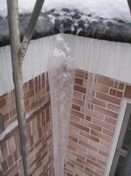 雪は落ちないようですが、屋根に雪が積もったままの場合、いろいろ問題も起きているようです。 外気温が上がれば、屋根の雪も融けます。屋根に勾配があるから、融けた水は流れます。それが屋根の先端でツララになったり、氷の塊になることもあります。 この写真はその一例で屋根の先端にツララができ、かなり大きな氷の塊ができています。 こちらの住宅では「すがもり」が発生しました。