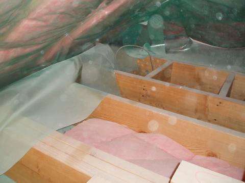 こちらの場合は下の写真のように屋根先端部の気密シートが開放されており、ここから室内の暖かい空気が流れ出し、屋根の雪を融かしたのが原因です。また、この先端部の断熱不足も要因の1つです。