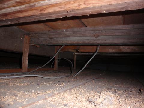□右の写真が小屋裏の状態ですが、 どこかで使った古材をかなり使用しています